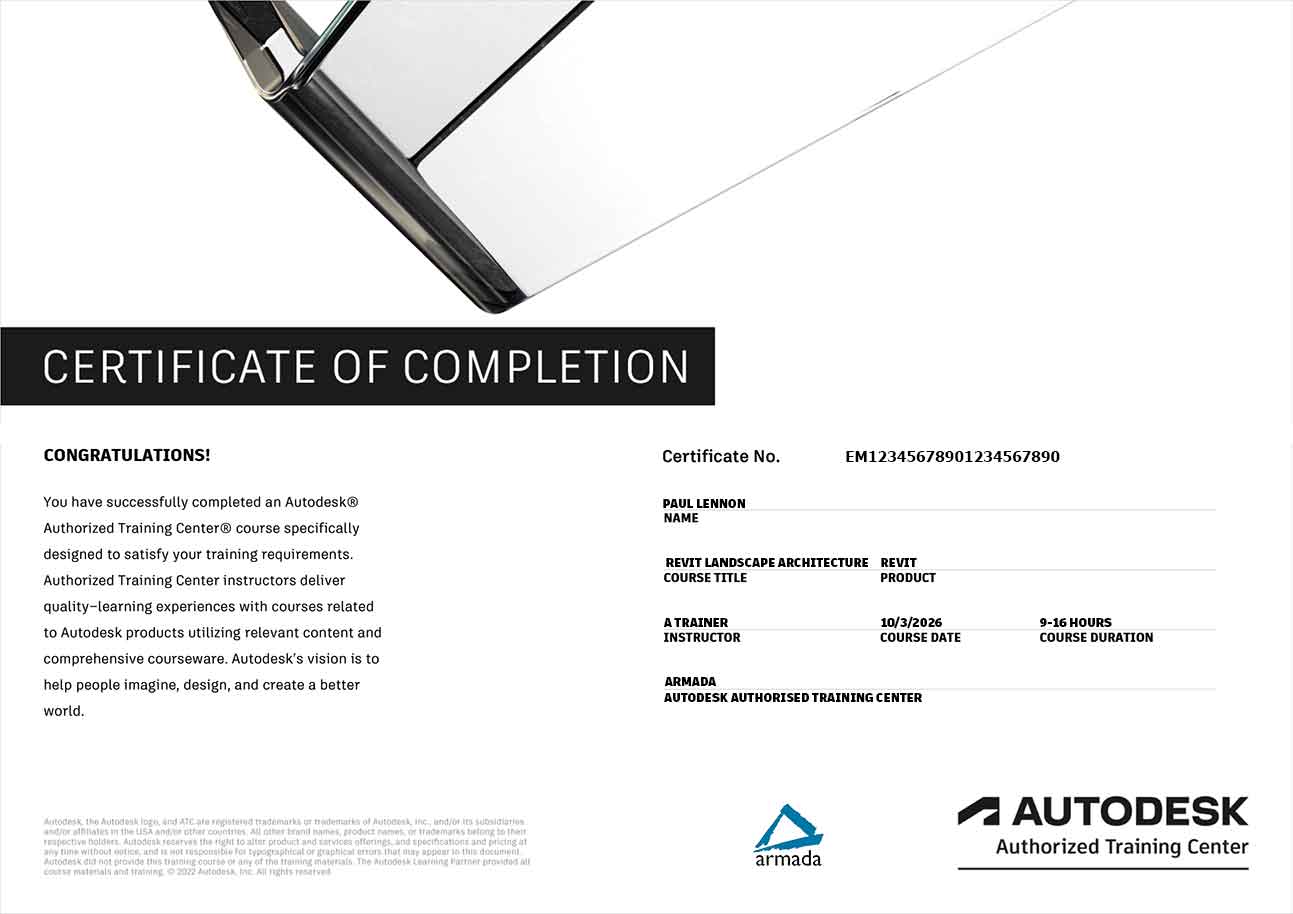 - An e-certificate confirming successful completion of an accredited Revit Landscape Architecture training course. Click here to see an example of the certificate you receive.